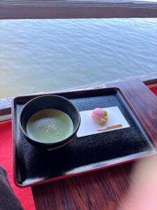 この景色を眺めながら優雅にお抹茶と和菓子をいただきました。
